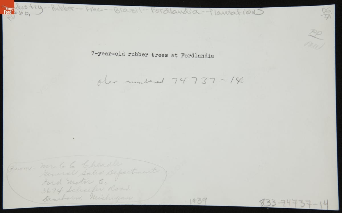 on back: Young rubber under first tapping, Fordlandia