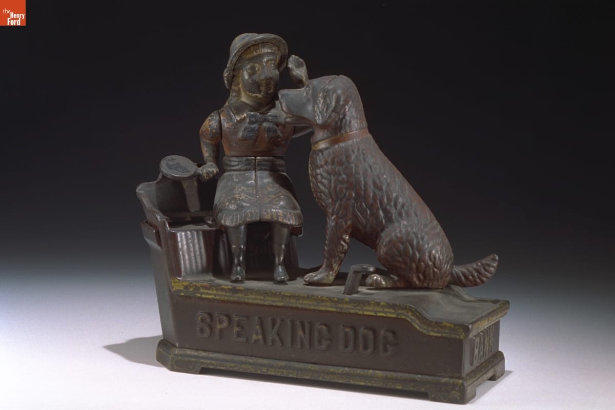 Depressing a lever on the base near the dog causes the girl's right arm to move back, dropping the coin placed on the tray into the seat opening beside her, while the dog opens its mouth as if barking and wags its tail. The Shepard Hardware Company began producing these mechanical banks about 1882, but sold this line in 1892.