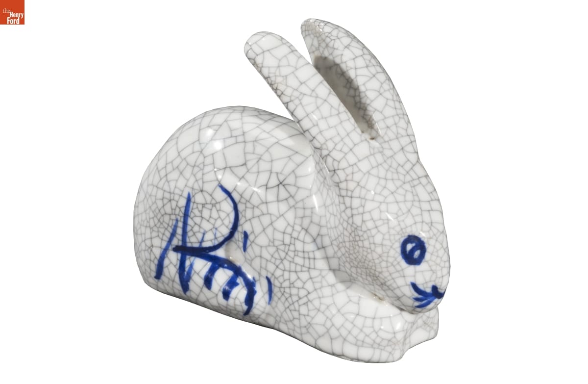 This crouching rabbit is iconic to the wares made by the Dedham Pottery. In business from 1896 to 1943, Dedham Pottery produced high-fired stone-ware characterized by a controlled and fine crackle glaze with thick cobalt blue border designs. Influenced by Arts and Crafts styles, these popular serving pieces primarily featured rabbits, but others imagery included elephants, dolphins, polar bears, chicks, swans, turtles, and ducks.