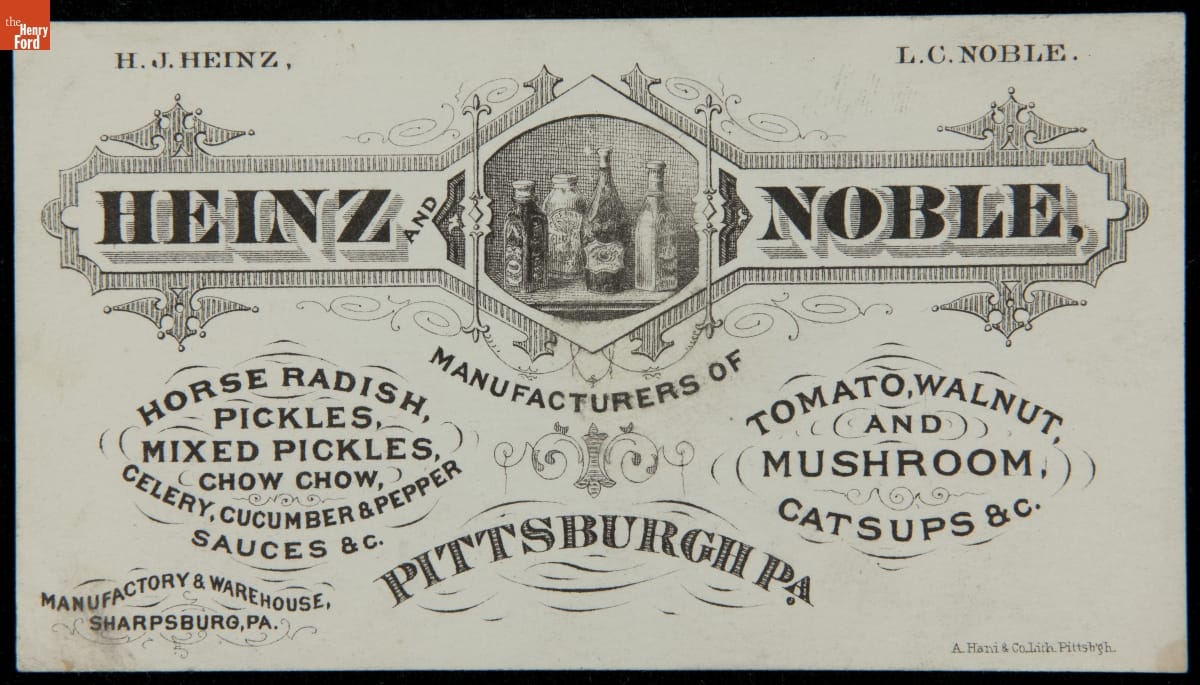 In 1869, H.J. Heinz entered his first business partnership to form Heinz & Noble. It began by exclusively selling horseradish and within a few years expanded to include pickles and condiments such as celery sauce and "catsups." Heinz & Noble advertised its products in a variety of methods, including trade cards -- a medium that gained momentum in the late 19th century.