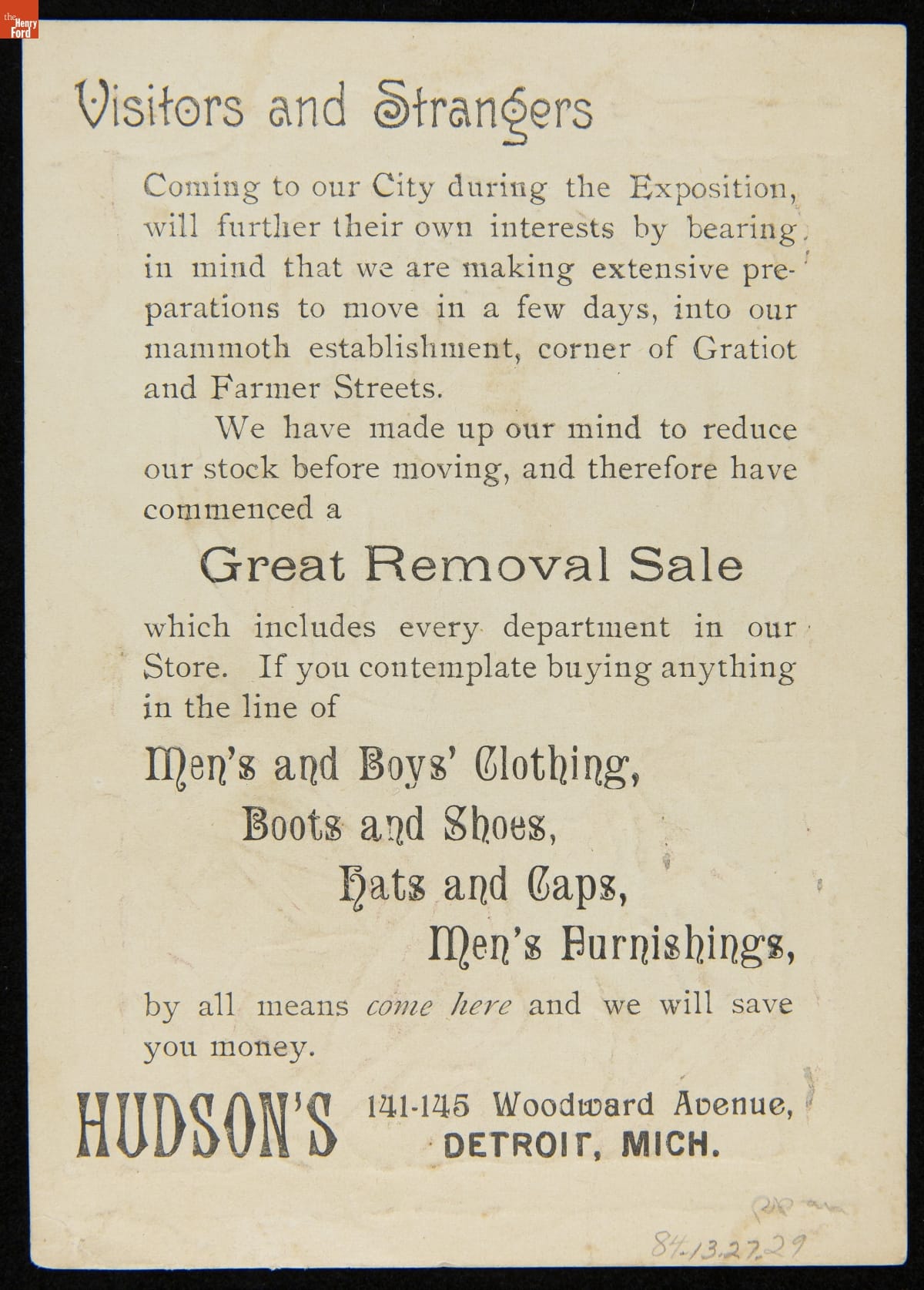 Trade Card for the J.L. Hudson Company, 1891