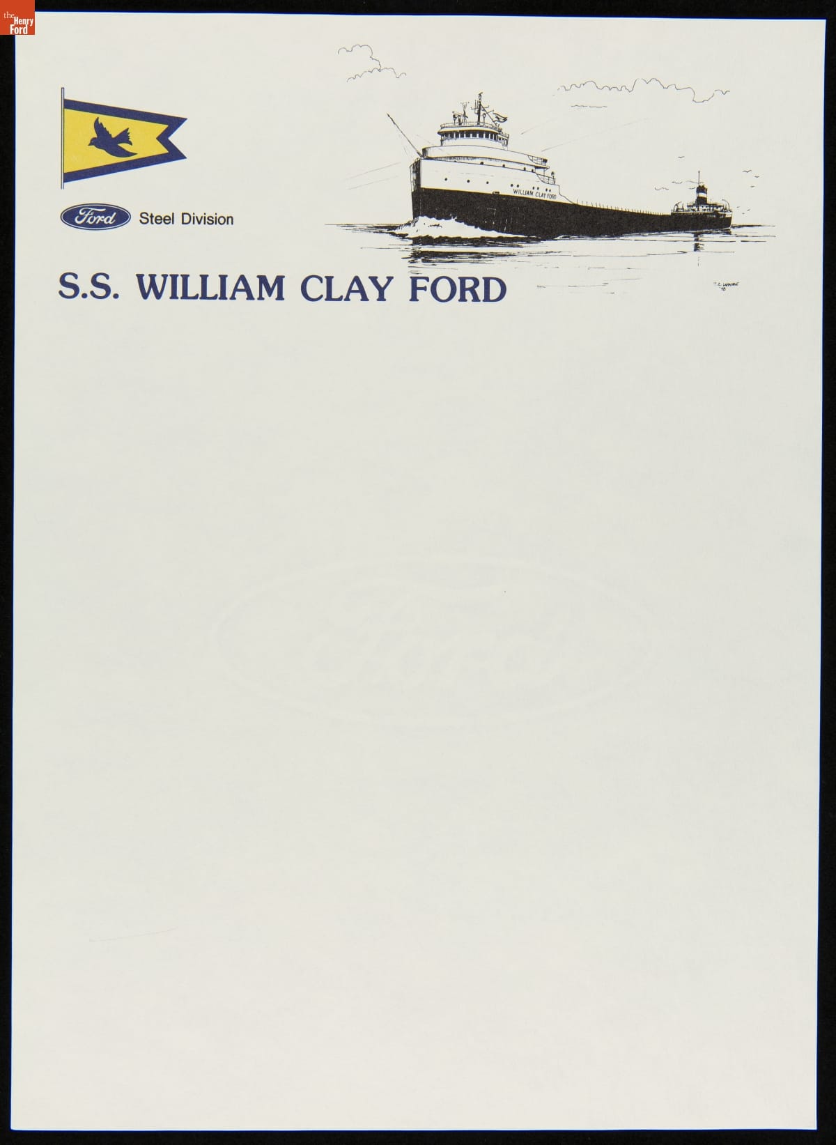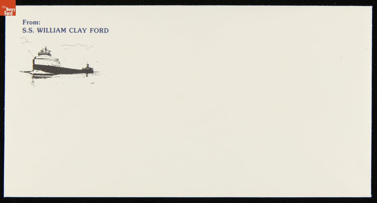 Stationery for the Ford Motor Company's ore carrier William Clay Ford contains images of the freighter, the Ford logo, and the house flag flown when the ship was underway. The flag depicts a bluebird -- a favorite of Henry Ford, an amateur birdwatcher. The ship, launched in 1953, hauled raw material to Ford's River Rouge factory near Detroit, Michigan.
