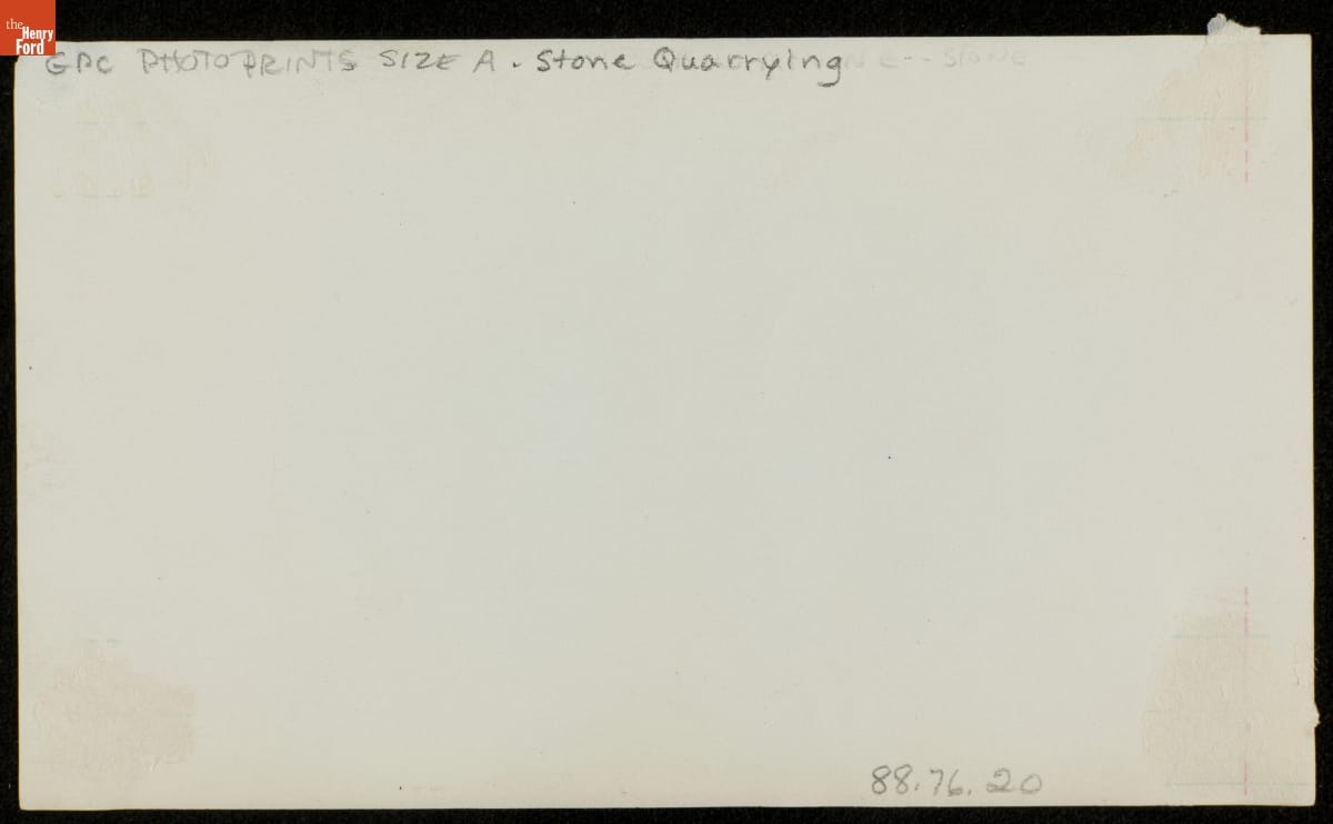 Before it fell, the hoist pictured here would have helped workers lift and transport material taken from this unidentified quarry. The photograph was clipped from a scrapbook owned by Detroit Edison electric utility's Photographic Department. Subjects included quarries, lumbering operations, railroad building, electric power stations, and waterways throughout the state of Michigan.