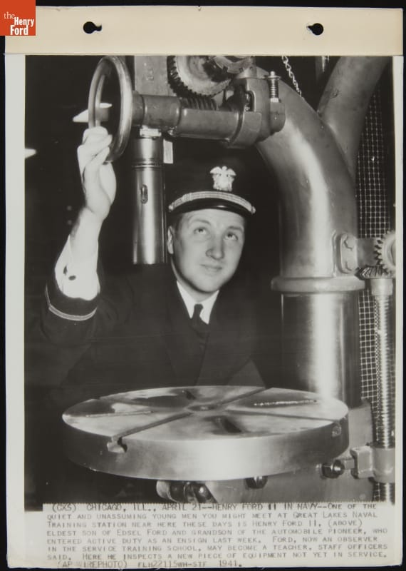 Henry Ford II, son of Edsel Ford and grandson of Henry Ford, joined the U.S. Navy during World War II. The Navy planned to have him teach at the Great Lakes Naval Training Station in Chicago. But when his father died in May 1943, Henry Ford II was released to return to Ford Motor Company, a crucial military contractor.