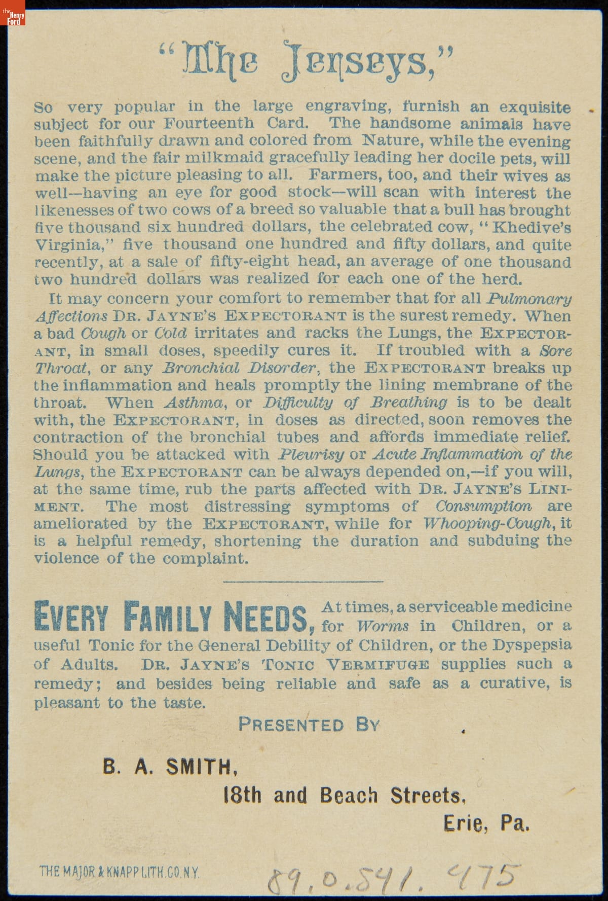 Trade Card for Dr. Jayne's Patent Medicines, "The Jerseys," 1880-1900