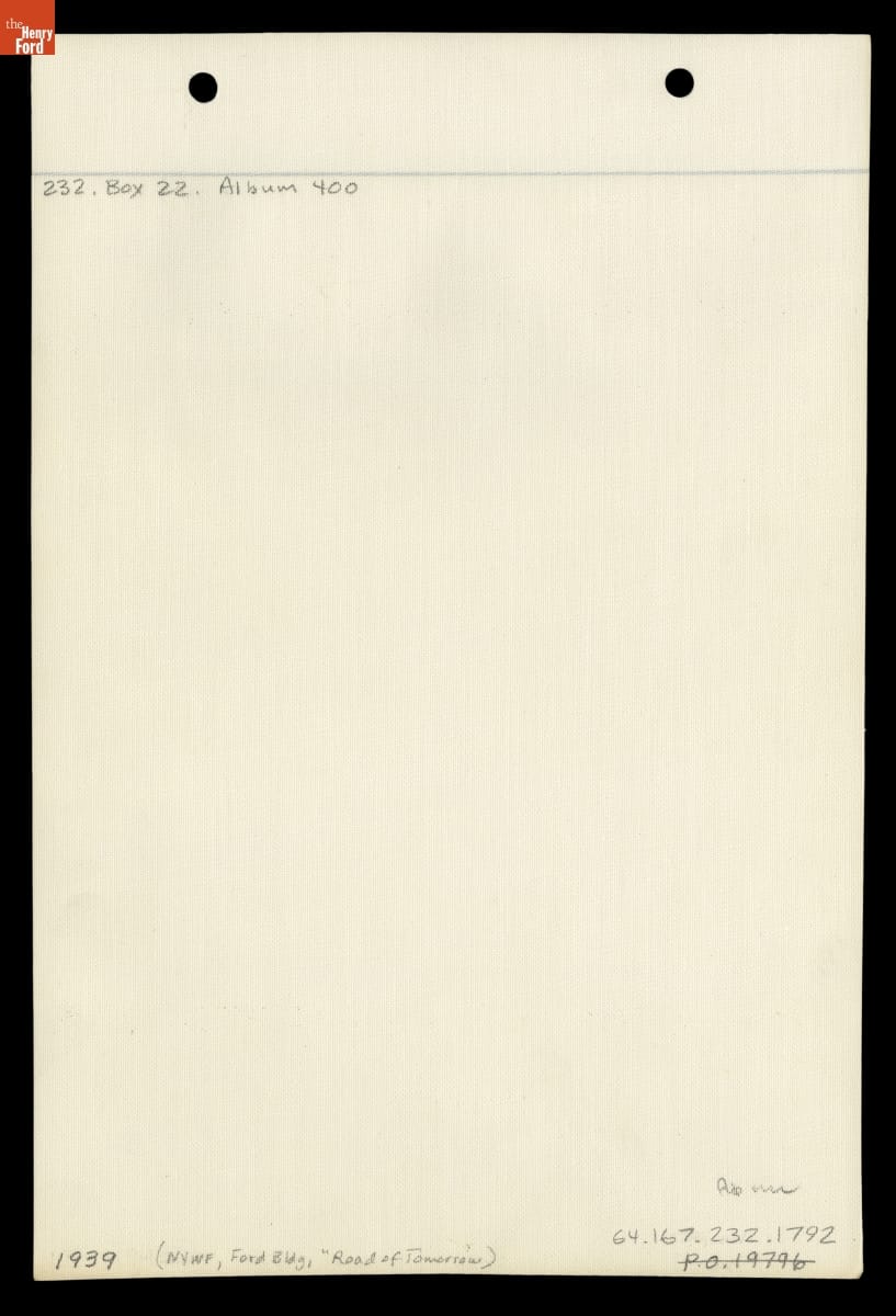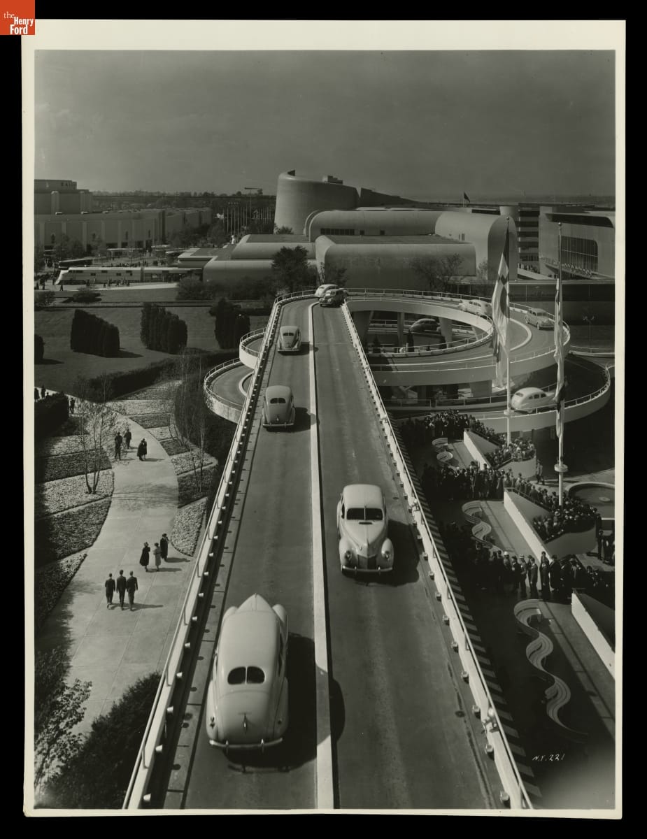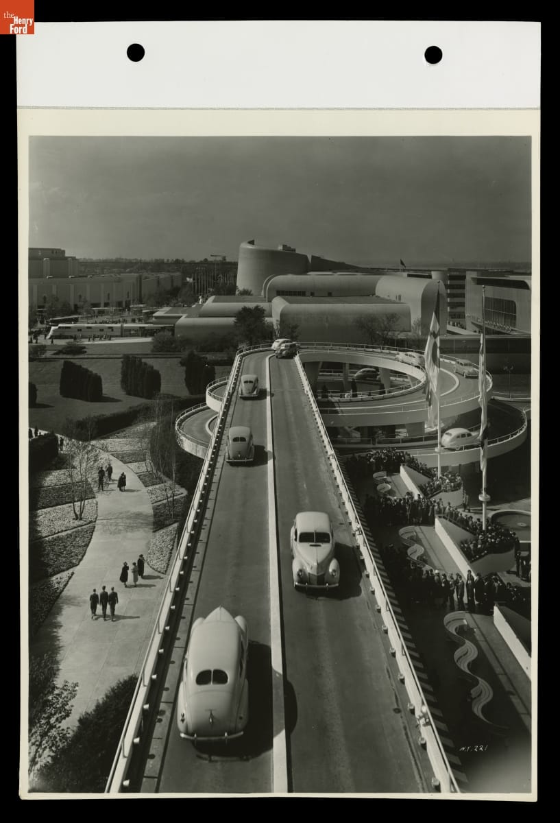 Ford Motor Company was a major participant in the 1939-40 New York World's Fair. In addition to viewing educational demonstrations and exhibits, Ford exposition visitors could ride in brand-new Ford automobiles along the Road of Tomorrow. Befitting the fair's "Building the World of Tomorrow" theme, this conceptual highway experience suggested modern techniques for safer, quieter, and more efficient roadways.