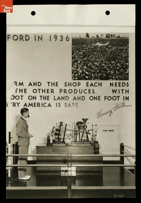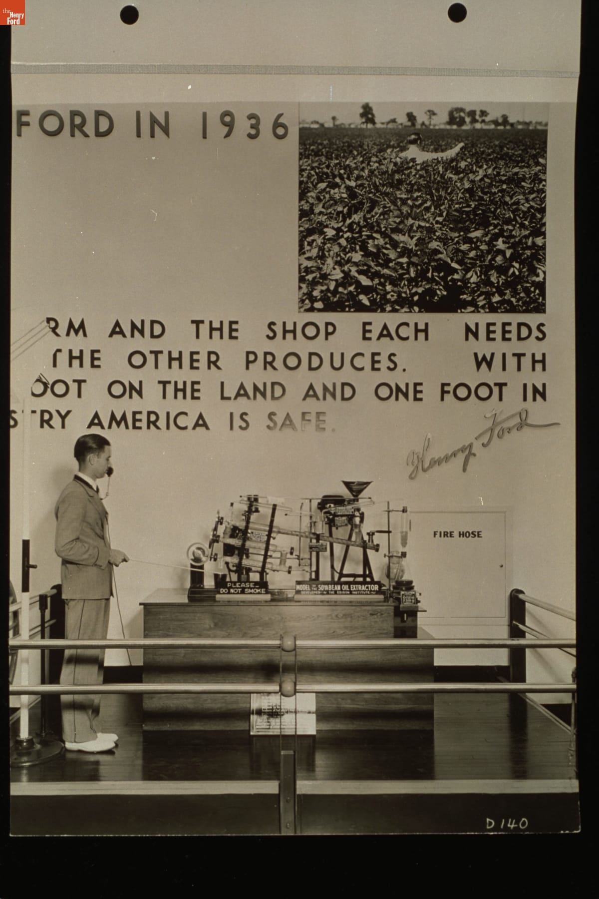 Ford promoted soybeans at the World Fairs and Exposition of the 1930s. In this image, a presenter at the Texas Centennial Exposition demonstrates how the soybean extraction process works with a model of a soybean extractor.