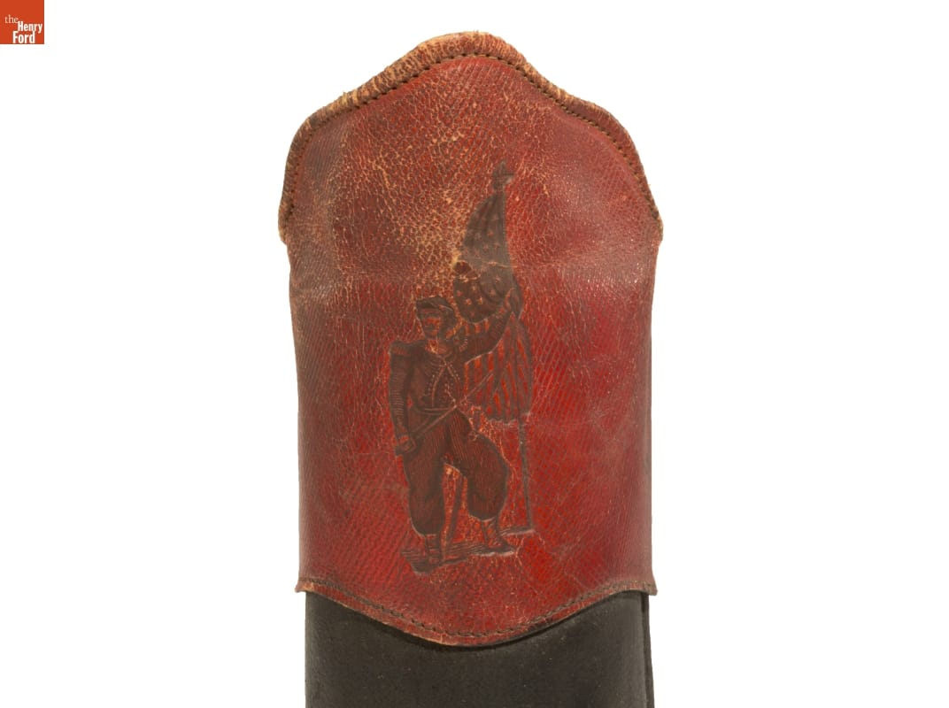 Children's clothing has increasingly included images that have appeal for a child. An early example is this pair of boots with a figure of a dashing Zouave soldier. Some Civil War units on both sides adopted the uniform and tactics of the French Army's Zouave regiments--modeled after the fast-moving, agile fighting styles of the Algerian Berbers who had fought the French in North Africa.