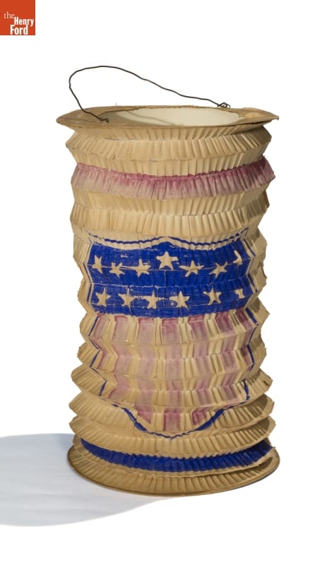 Late-nineteenth-century political parties rallied their supporters by holding torchlight parades. In the evening, marchers lit up the street carrying torches, lamps and lanterns. Inexpensive paper lanterns glowed with the image or name of the party's candidate or other patriotic imagery. This accordion-pleated lantern is decorated with a simple red, white and blue shield.