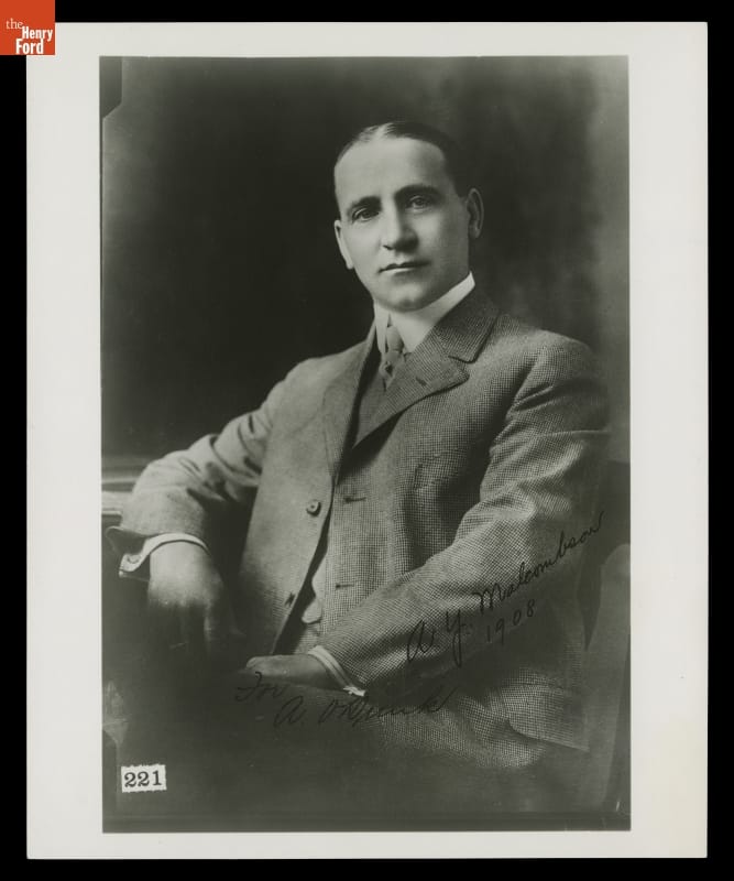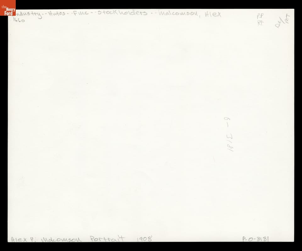 Alexander Y. Malcomson was Detroit's largest coal dealer and Henry Ford's business partner. Using Malcomson's money, Ford bought machinery and material to prototype Ford Motor Company's first automobile. Malcomson sold his Ford stock in 1906 after a dispute over the direction of the company. His other automotive venture, Aerocar, was short-lived. Aerocar went broke in 1908, the year this portrait was made.