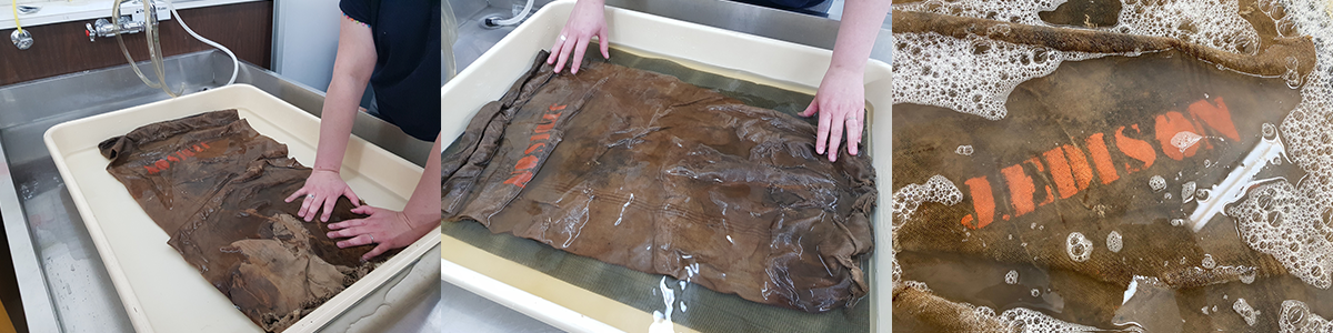 After vacuuming, conservators worked with textile Conservation Specialist Katrina Herron to perform a wet cleaning. The bag was submerged in a tray filled with tap water. The bag was lightly agitated to remove dust and contaminants. The water was replaced and the process repeated until the water was clear enough to call the bag “clean.” While changing the water, the bag was rolled with a mesh sheet and set aside. This technique reduces the likelihood of damage to the bag when carried flat, as the weight of the water can cause too much tension to the fibers.