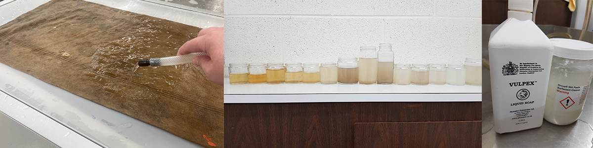 The water was changed a total of fourteen times. At the beginning of the process, the dust and contaminants were removed with only tap water. The next cycles used tap water mixed with liquid soap. Orvus and Vulpex are gentle cleaners used by our conservation staff. In this project, they were used to clean the stains on the surface of the bag by pressing it with a soft sponge. In the end, deionized water was used to rinse out the soap thoroughly. Each time the water was replaced, a sample of the water was taken to determine the level of contamination.