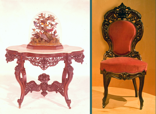 The Henry Ford also owns a center table and two chairs, purchased by Mary Lincoln in 1866 for her Chicago home, where she moved after Lincoln’s death. They contrast greatly with the Springfield furniture. Exuberantly carved pieces, this Rococo Revival table and chair represent a marked evolution in taste and also reflects an ability to afford high style furnishings following the Lincolns’ White House years.