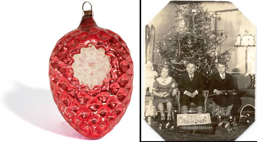 Left: This shiny bauble – called an indent because of its concave floral design - is representative of the German ornaments exported to the United States in the 1920s and 1930s. Its detailed form and silvered finish were nearly impossible for American glassmakers to replicate. 2004.87.26 (THF155292), Gift of family of Joseph & Helen (Szczepaniak) Lyk. Right: An American Christmas tree laden with imported glass ornaments served as a backdrop for this holiday snapshot taken around 1935. 96.119.1 (THF43930)