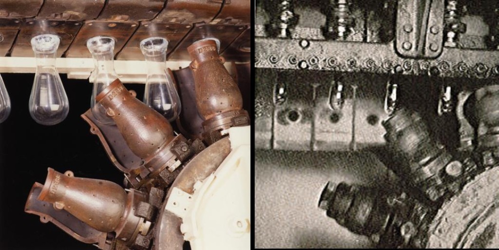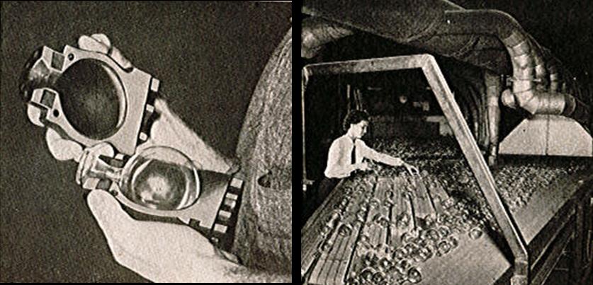 Left: Corning glass ribbon machine #3 demonstrates incandescent lamp bulb manufacture at Henry Ford Museum