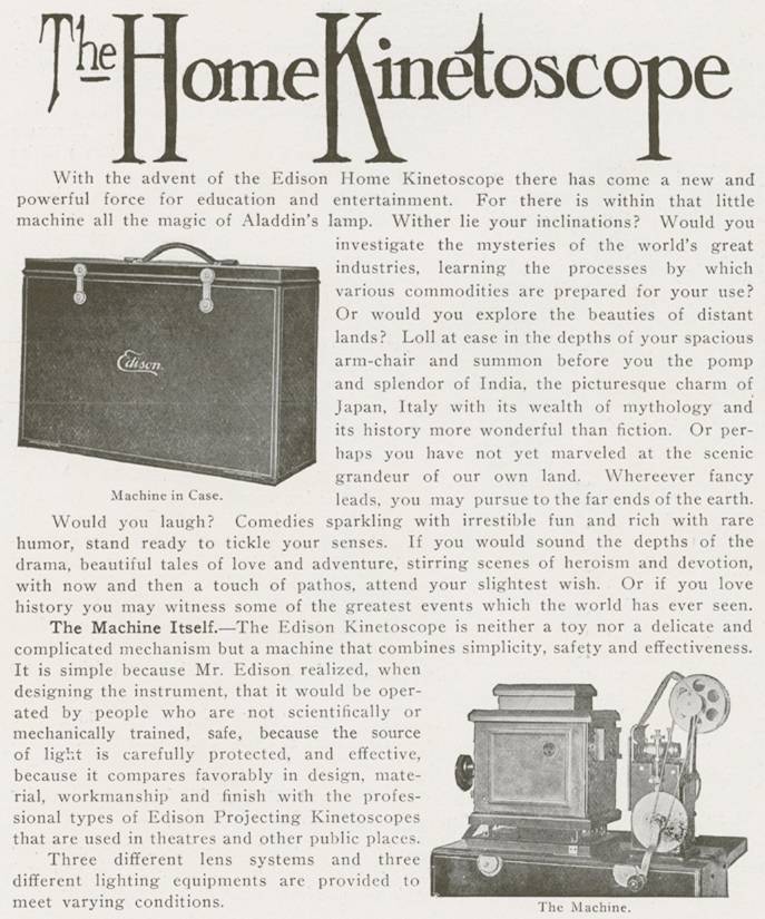 Thomas Edison is considered the father of motion pictures. He invented the original movie camera, the kinetograph, which was used to film movies shot at his movie studio, the Black Maria, the foremost of its kind. His lab developed the earliest films in motion picture history, and those movies were exhibited on a peep hole-like device, the kinetoscope—yet another Edison creation. On November 30th, 1897, Edison’s Projecting Kinetoscope was used to show movies on a screen in a commercial setting for the first time. In December 1903, the Edison Manufacturing Company released The Great Train Robbery, which would go on to be the initial motion picture blockbuster. The film industry would prove to be successful, yet rocky, for Edison over the next few years, but in 1912, the year his company launched the Home Projecting Kinetoscope, optimism was in the air.