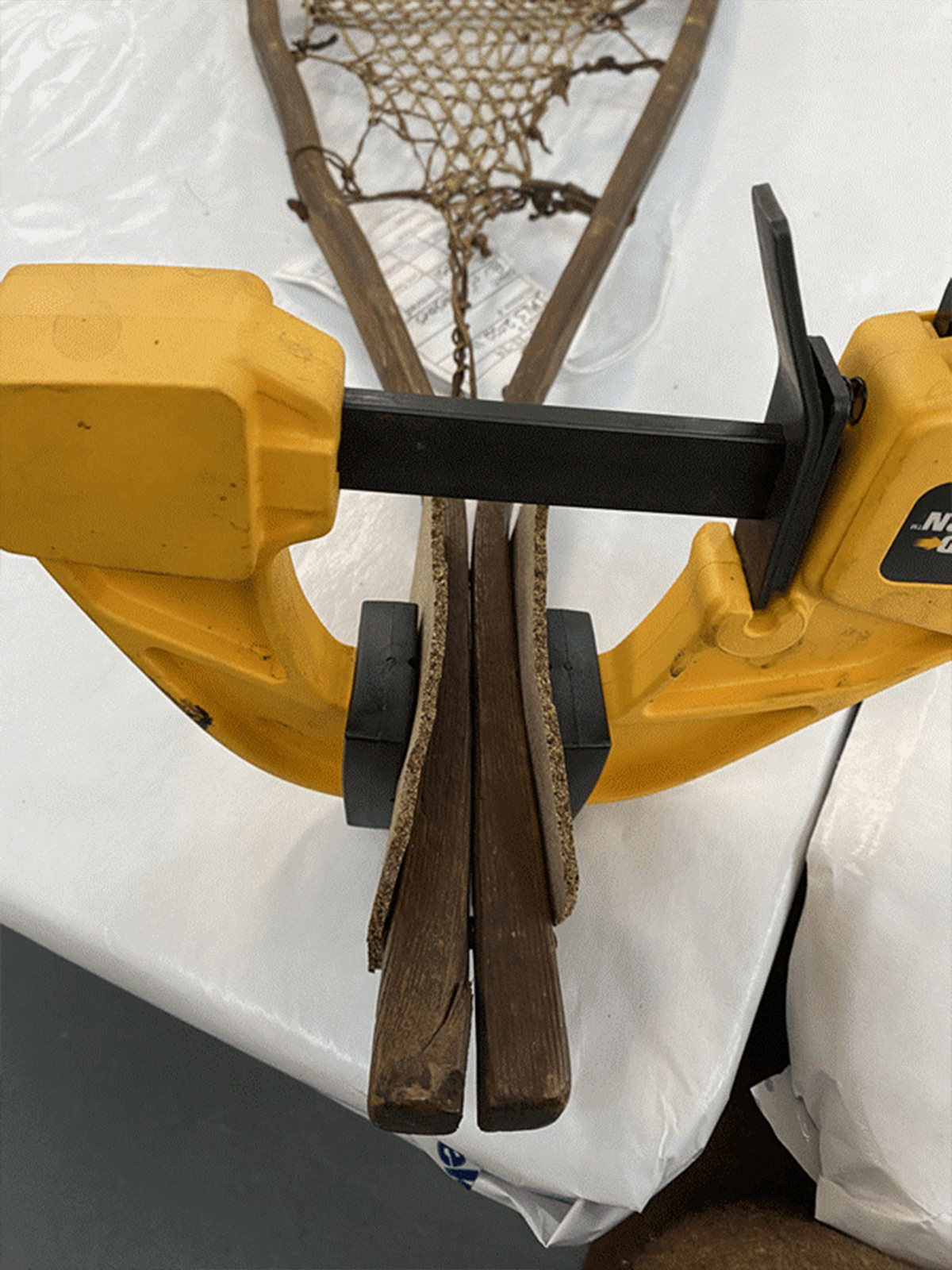 One shoe of a pair of snowshoes needed stabilization before proper handling. A section of the wood frame was missing, leaving sharp pieces of wood sticking out. The dowels keeping the tail together had split, causing more tension on the weakened rawhide webbing. / Images by Jeeeun Sims (Jee Eun Lim)