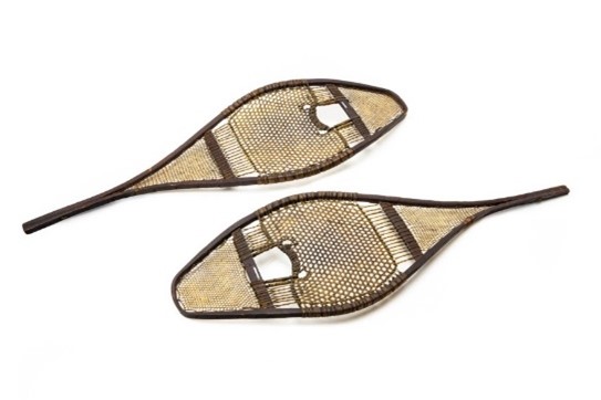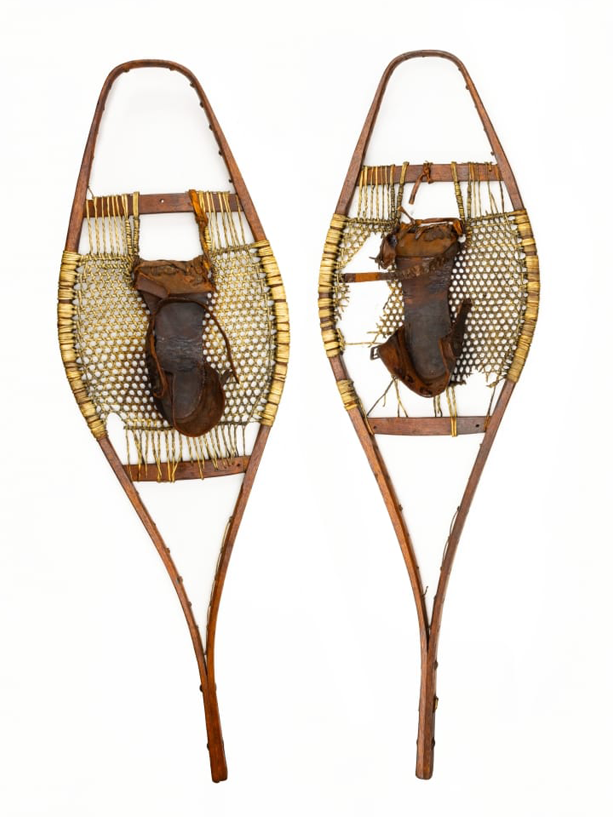Snowshoes have a long history in North America. Indigenous peoples invented the form using thin strips of collagenous material (sinew or treated hide) and bent wood. The woven strips created a netting used for walking on snow. In fact, using snowshoes helped Indigenous peoples in snowy areas thrive during wintertime. The shoes facilitated trade, hunting, trapping, and self-defense. You can read more about the advantages of Indigenous snowshoe knowledge in Thomas M. Wickman’s book, Snowshoe Country: An Environmental and Cultural History of Winter in the Early American Northeast (2018).