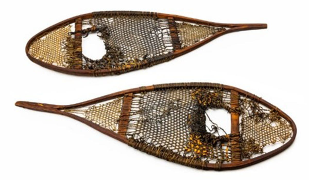 Indigenous knowledge remained essential to snowshoe construction. A photograph shows Ojibwa people selling baskets, and in the background, a pair of snowshoes leaning against a tree. The snowshoes treated during the IMLS grant project lack the decorative tufts of either dyed moose hair or wool visible on the Ojibwa snowshoes, but the intact webbing, carefully conserved, still indicates the craftsmanship evident in each shoe.