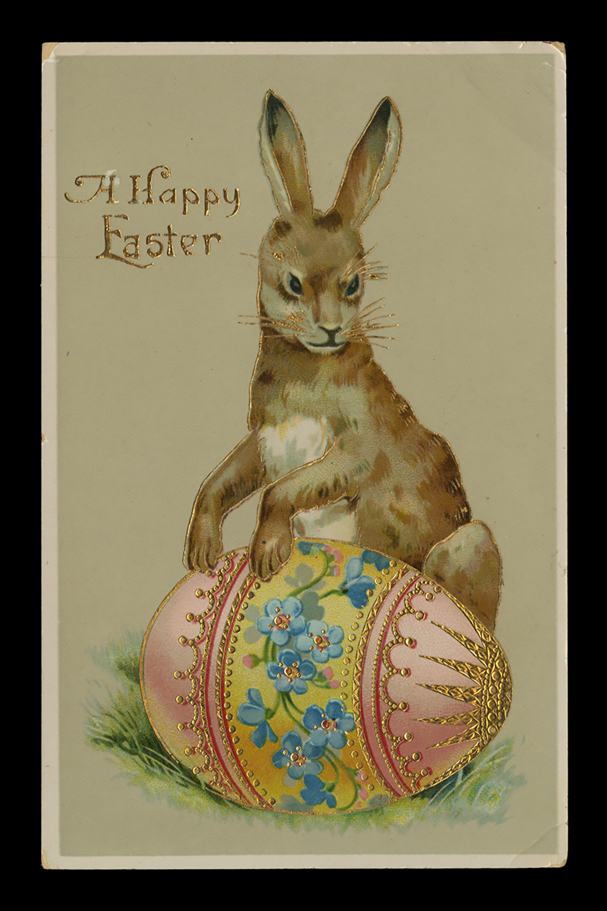 The Easter Bunny (originally known as the Easter Hare or Easter Rabbit) is believed to have originated in German folklore, which described the mythic creature bringing colorfully decorated eggs to children. Whether the Easter Bunny laid the eggs or hid them may be a matter of interpretation, especially when inquisitive children ask for explanations. Written accounts from Germany in the 1680s mention the Easter egg-laying hare, identified hundreds of years later as the Easter "Bunny." German immigrants brought the tradition to colonial America, perhaps as early as the late 1600s. A drawing by Fraktur artist Johann Conrad Gilbert (1734-1812) depicting a hare hopping along with a basket of decorated eggs provides more substantial proof of the Easter Bunny in early America. Yet, few outside the areas populated by German-speaking immigrants recognized the mythic creature. By the late 1800s, however, the Easter Bunny — like Santa Claus and the Christmas tree — was well on its way to becoming an established holiday symbol throughout America. Growing commercialization of Easter materials — greeting cards, books, toys, candies and sweets, and other material — spread the holiday celebration across cultures, establishing the mythic egg-bringer as a holiday tradition. In the early 1900s, Americans would shed the monikers, Easter Hare or Easter Rabbit, in favor of the more kid-friendly Easter Bunny.