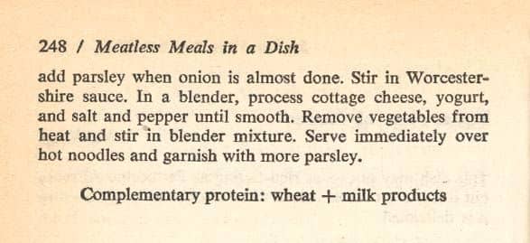 Hippie lifestyles of the 1960s encouraged Americans to think vegetarian in the late 20th century. This cookbook, first published in 1971, gave tips for cooking with non-meat protein-rich foods like grains, beans and peanuts instead of meat.